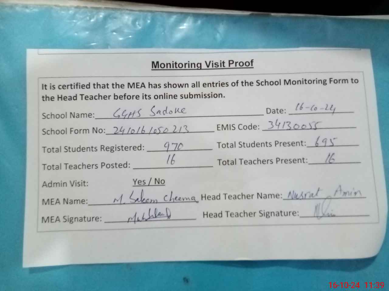| Certified that this School was Inspected by the Undersigned MEA/DMO Today and the Information Stated Above is as Per Record. | |||||