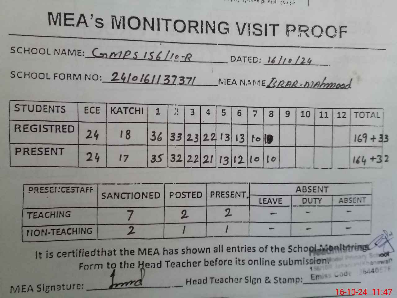 | EMIS Code: 36440576 | Name of School: GMPS 156/10-R, JAHANIAN | |||