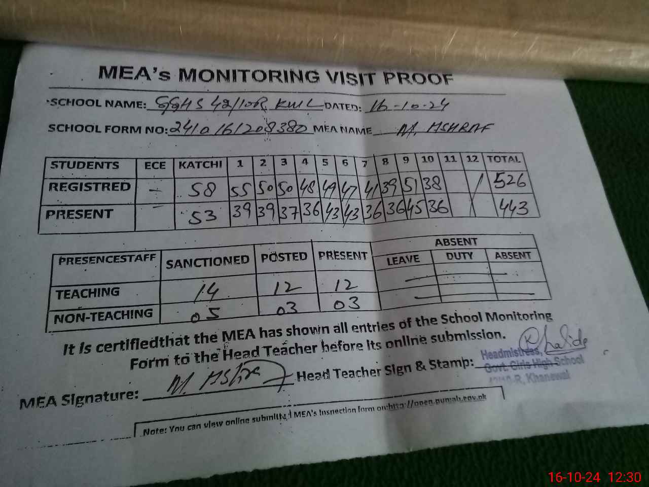| Attendance Register | Head Teacher | MEA with School | Visit Proof |