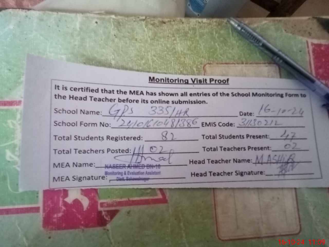 | EMIS Code: 31130212 | Name of School: GES CHAK NO 335/HR | |||