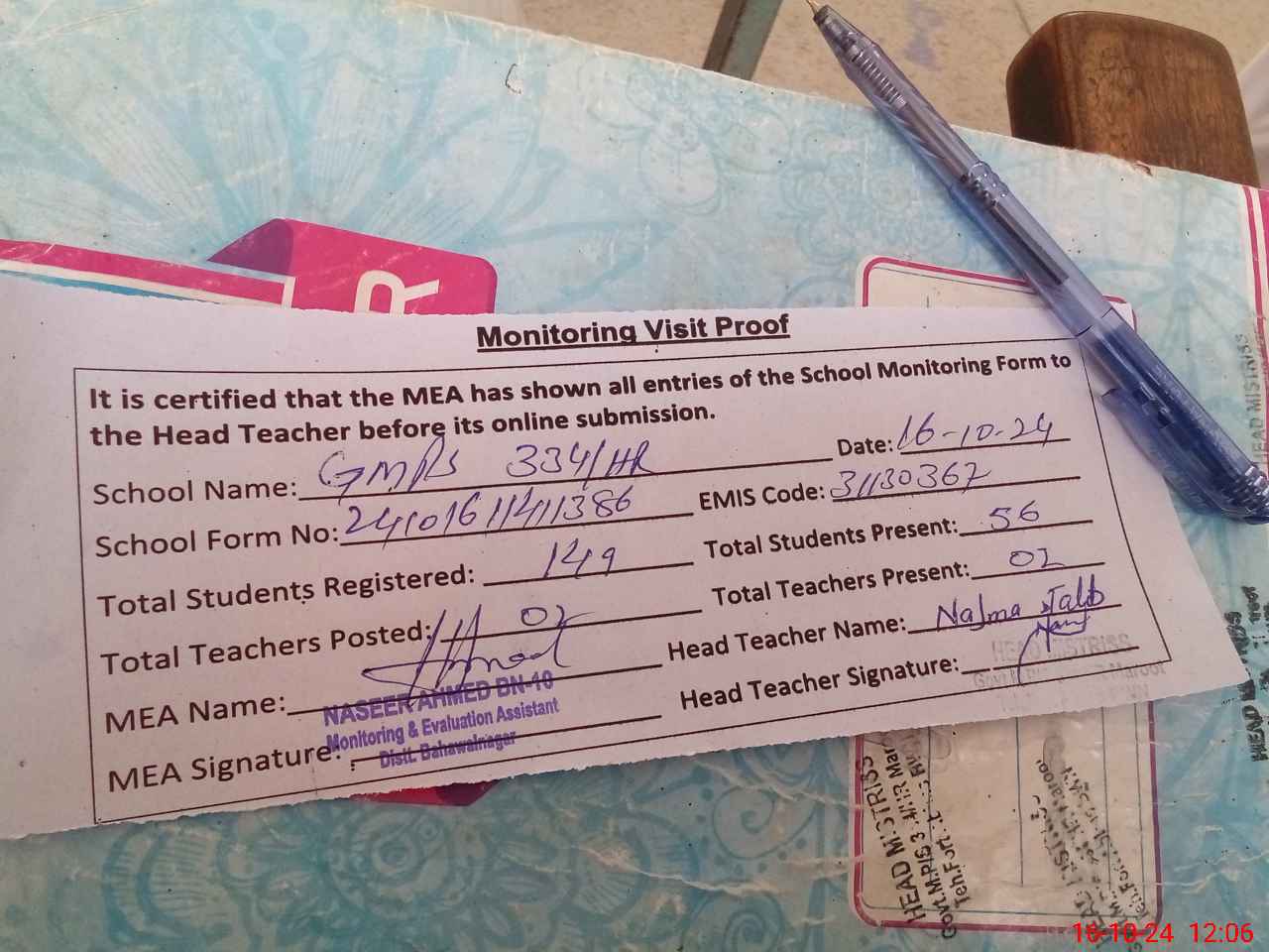 | EMIS Code: 31130367 | Name of School: GMPS CHAK NO. 334/HR | |||