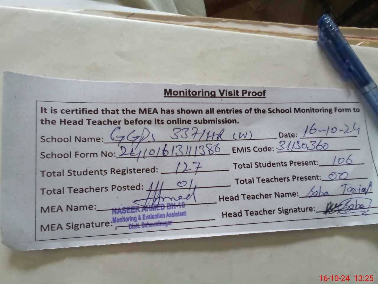 | EMIS Code: 31130360 | Name of School: GGPS CHAK NO 337 HR W | |||