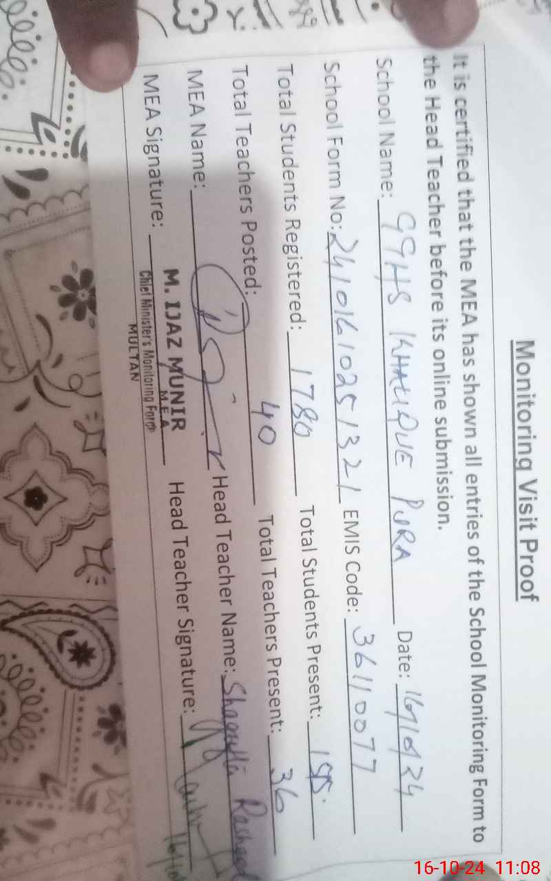 | EMIS Code: 36110077 | Name of School: GGHS KHALIQUE PURA KHALIQUE PURA | |||
