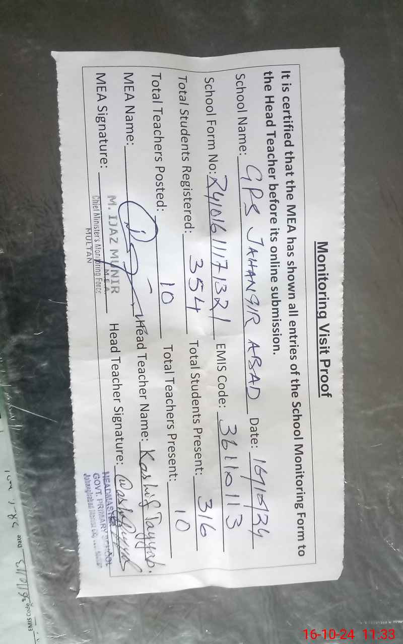 | EMIS Code: 36110113 | Name of School: GPS JAHANGIR ABAD NEAR KHANEWAL ROAD MULTAN | |||
