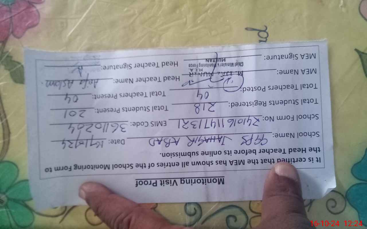 | Name: Ar**** As**** Designation: (School Headmaster's/Headmistress's) HEADMASTER Phone/Cell Number: 03**** |