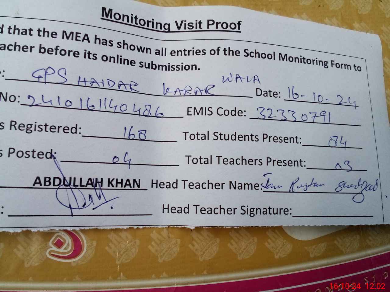 | EMIS Code: 32330791 | Name of School: GPS HAIDER KARAR WALA | |||