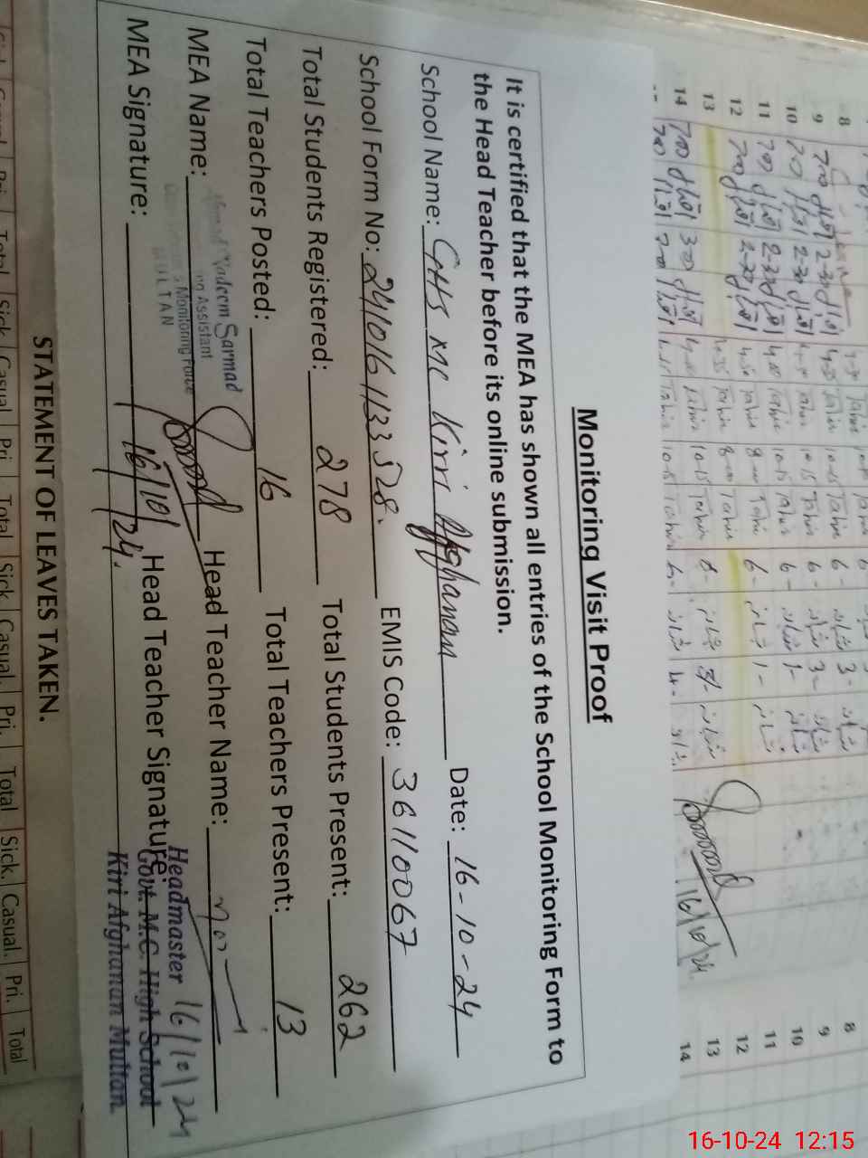 | Attendance Register | Head Teacher | MEA with School | Visit Proof |