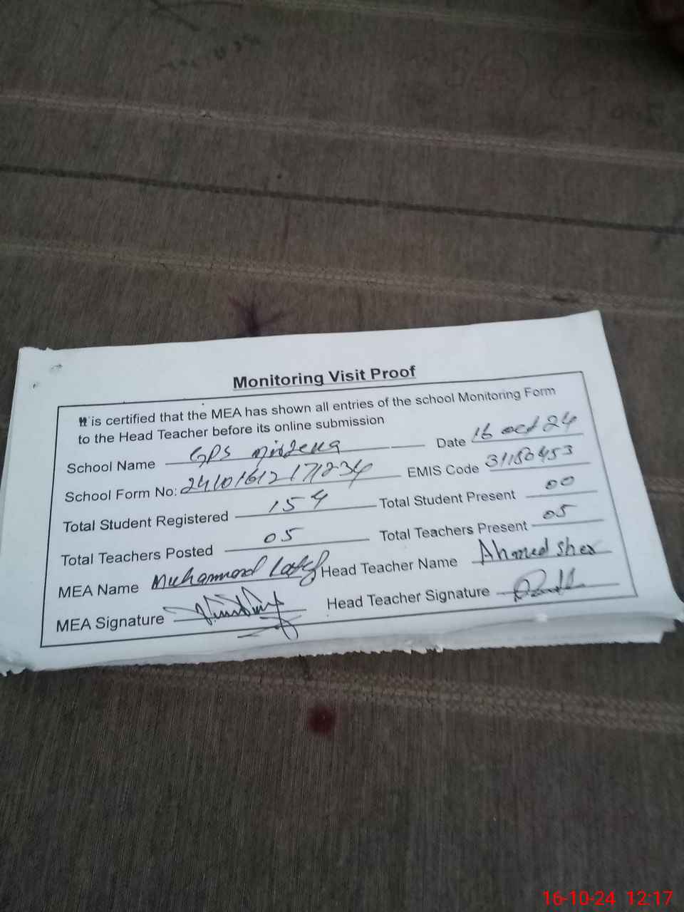 | Remarks (Use Separate Page if Required): Students are sitting in classes But not to allow head count of students By the head teacher | |||||