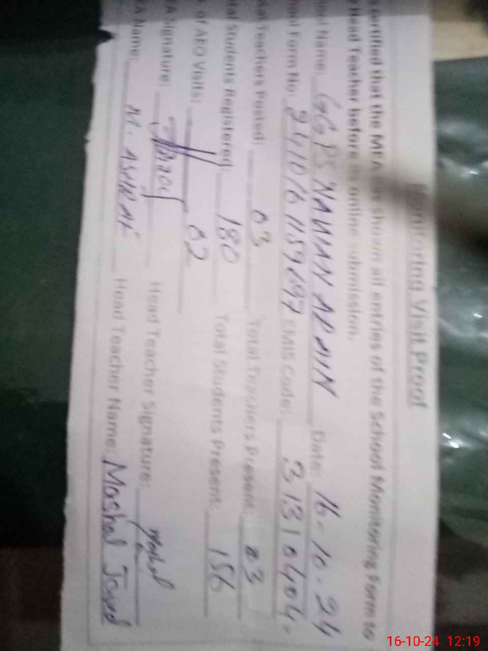 | Monitoring Date: 16-10-2024 | Start Time: 16-10-2024 11:59 AM | End Time: 16-10-2024 12:19 PM | Name of MEA: Mu**** As**** KP**** | |