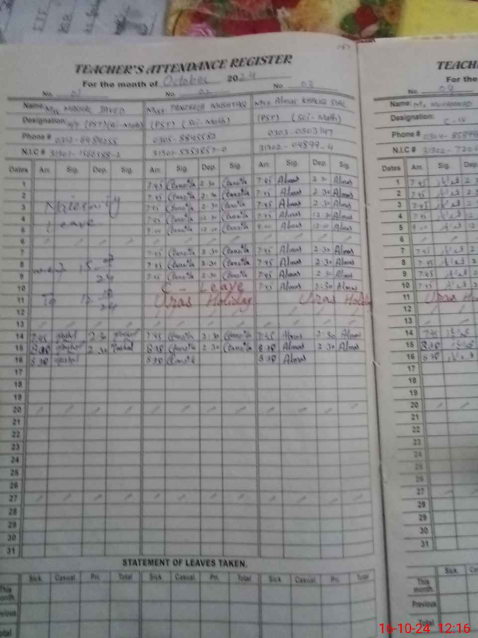 | CNIC | Full Name | Designation | R/C | Absence during last cal. month |