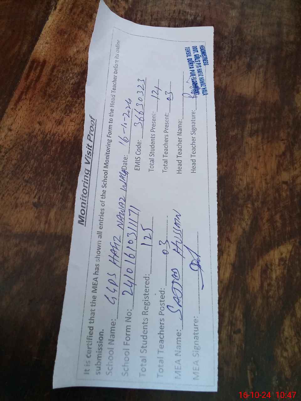 | Certified that this School was Inspected by the Undersigned MEA/DMO Today and the Information Stated Above is as Per Record. | |||||