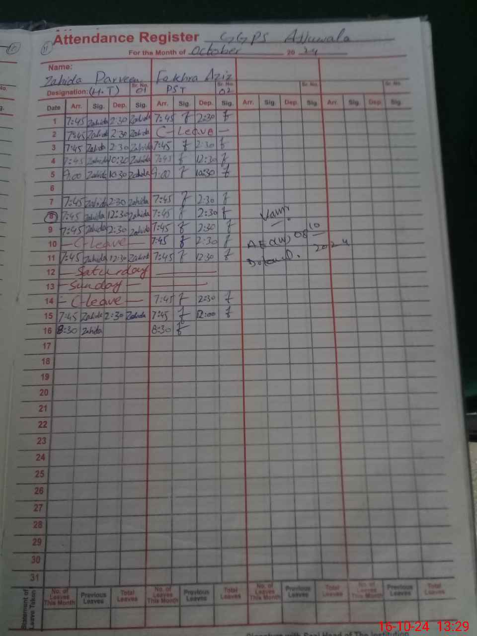 | CNIC | Full Name | Designation | R/C | Absence During Last Calender Month |
