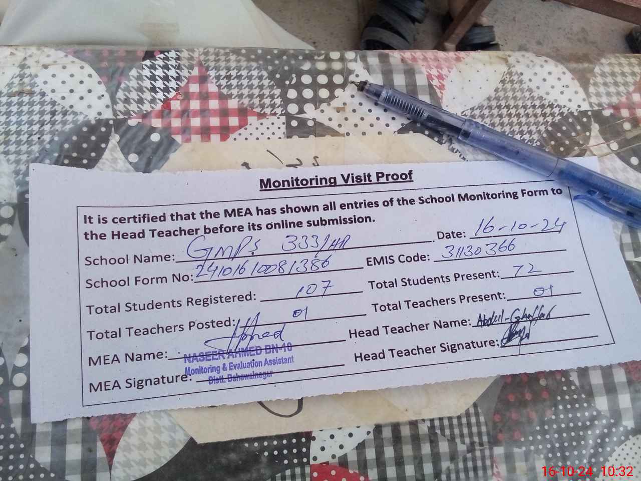 | EMIS Code: 31130366 | Name of School: GMPS CHAK NO 333 HR | |||