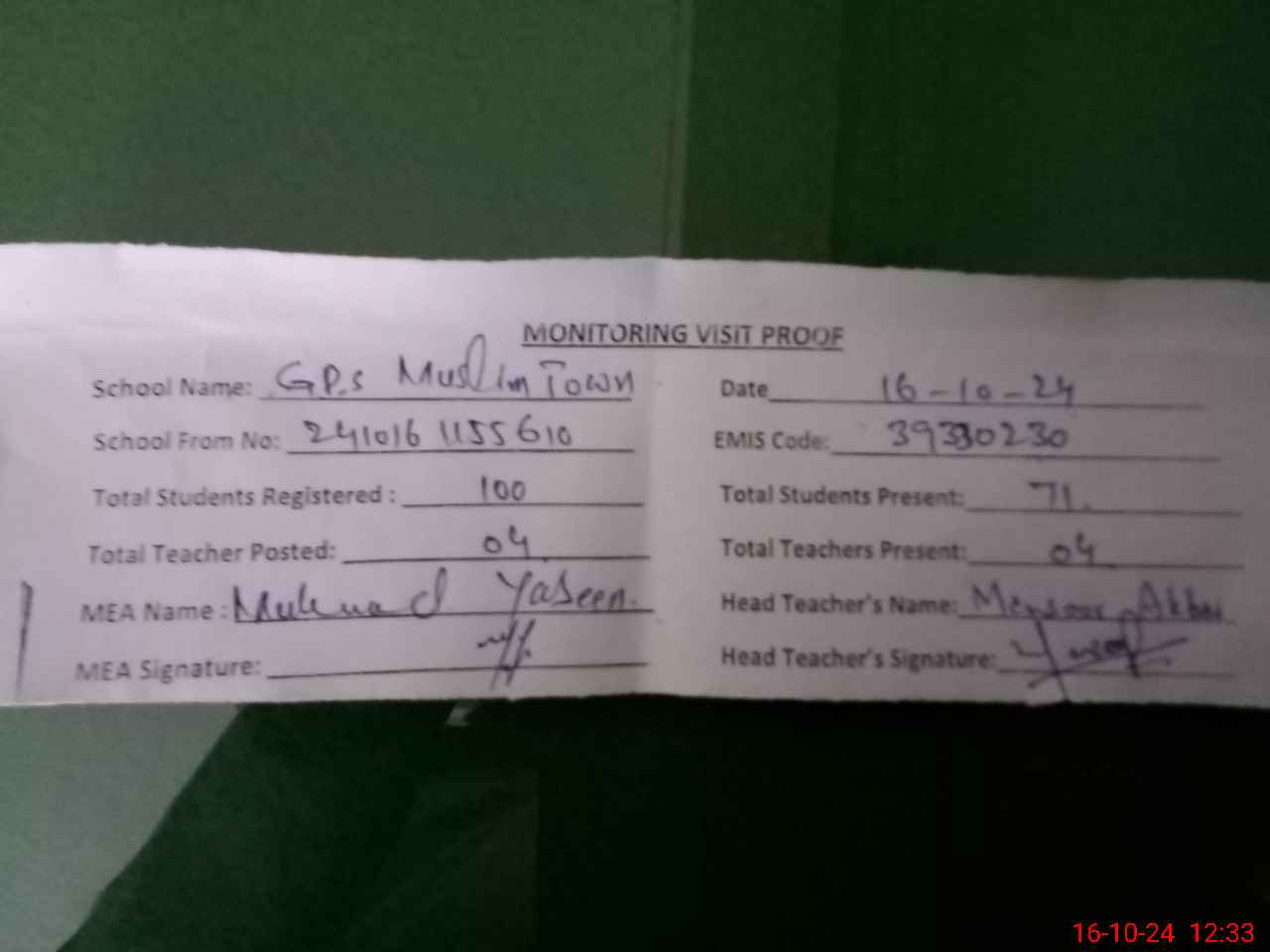 | Attendance Register | Head Teacher | MEA with School | Visit Proof |