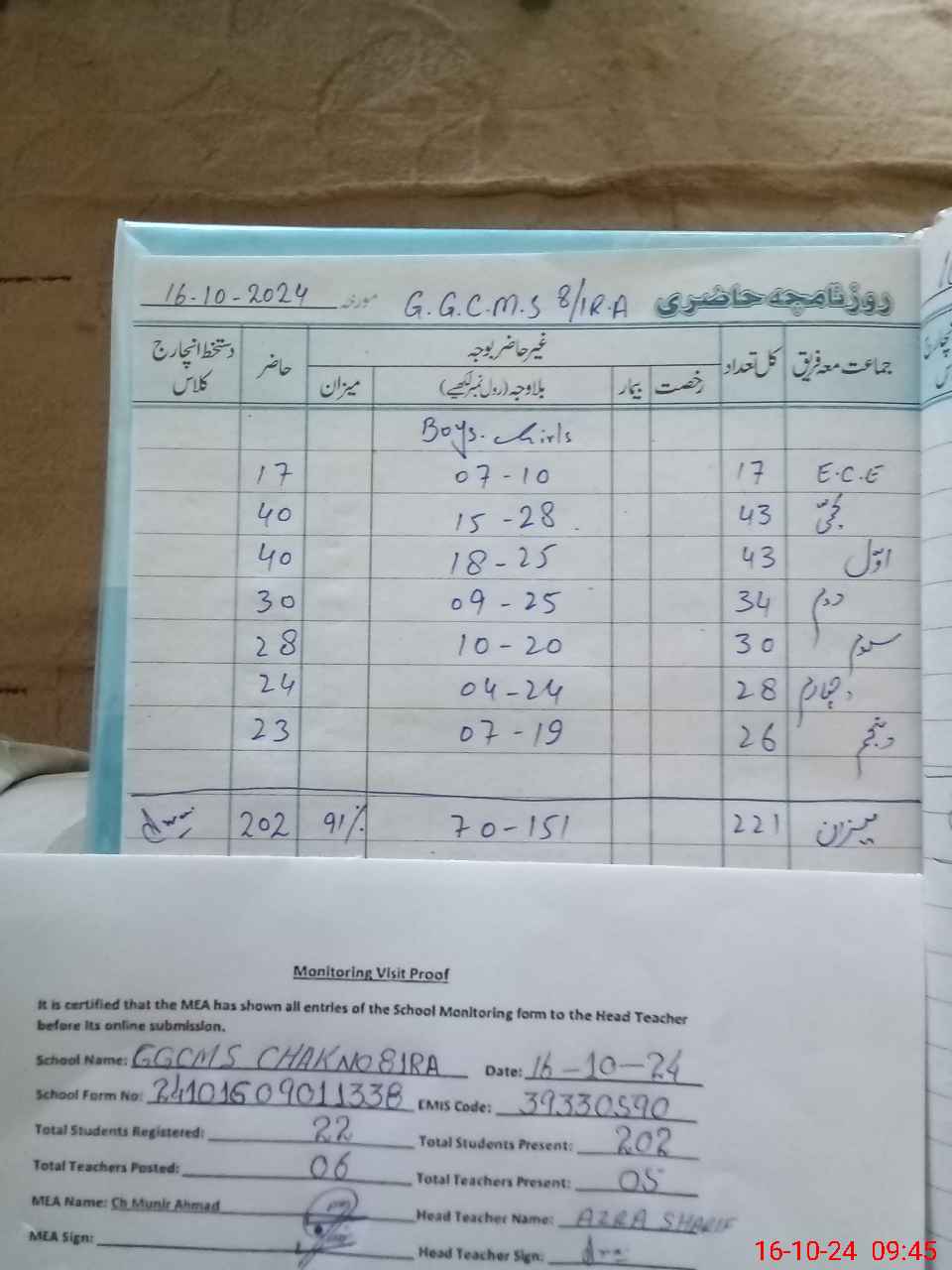 | Attendance Register | Head Teacher | MEA with School | Visit Proof |