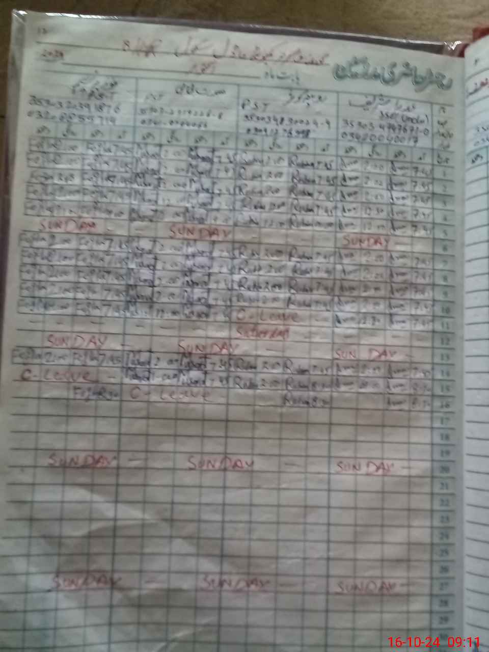 | CNIC | Full Name | Designation | R/C | Absence During Last Calender Month |