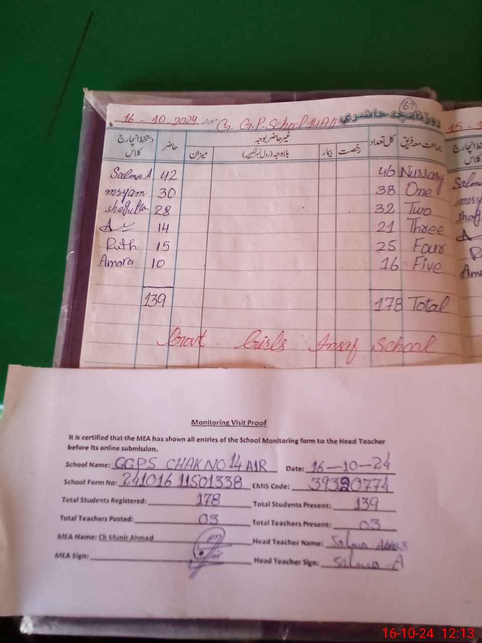 | Attendance Register | Head Teacher | MEA with School | Visit Proof |