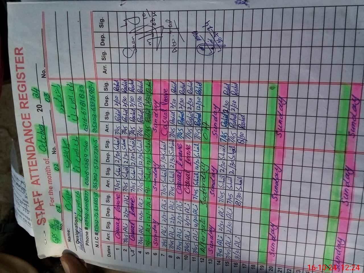 | CNIC | Full Name | Designation | R/C | Absence during last cal. month |