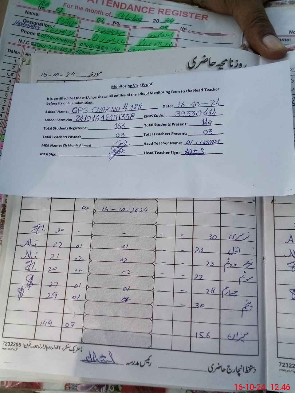 | Attendance Register | Head Teacher | MEA with School | Visit Proof |
