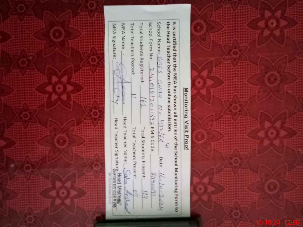 | Attendance Register | Head Teacher | MEA with School | Visit Proof |