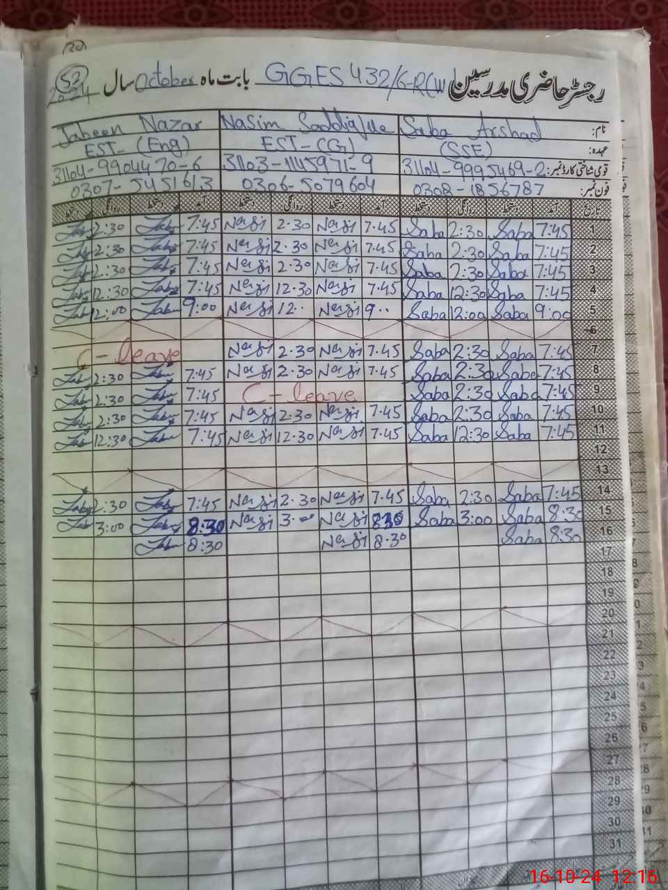 | CNIC | Full Name | Designation | R/C | Absence during last cal. month |