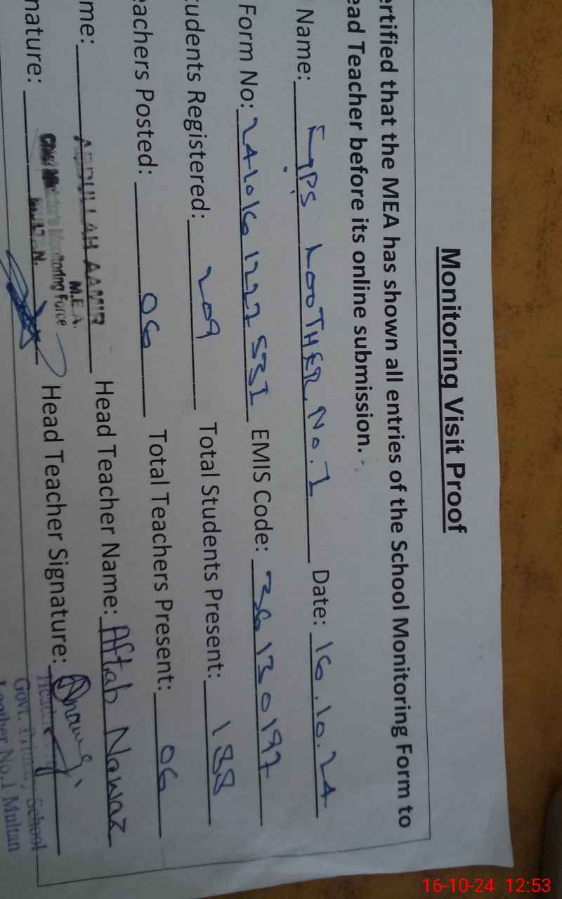 | EMIS Code: 36130197 | Name of School: GPS LOOTHER NO. 1 | |||