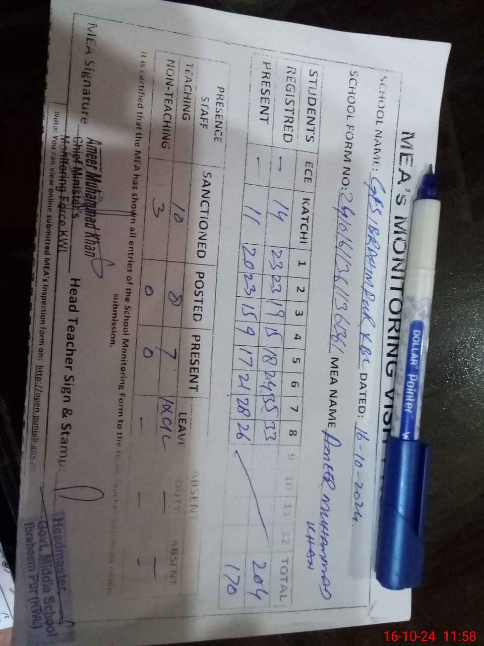| Certified that this School was Inspected by the Undersigned MEA/DMO Today and the Information Stated Above is as Per Record. | |||||