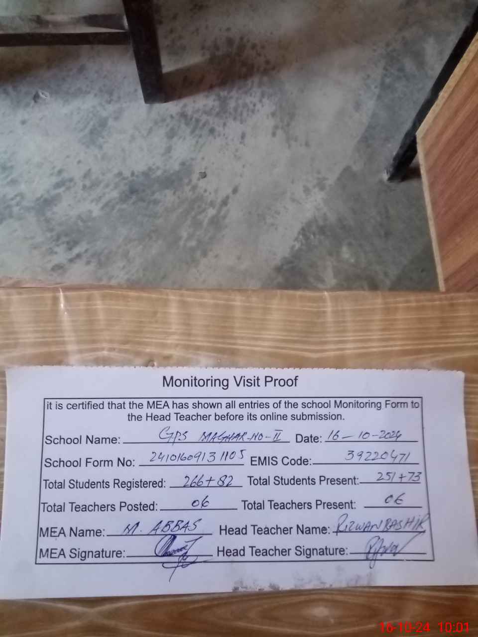 | Certified that this School was Inspected by the Undersigned MEA/DMO Today and the Information Stated Above is as Per Record. | |||||