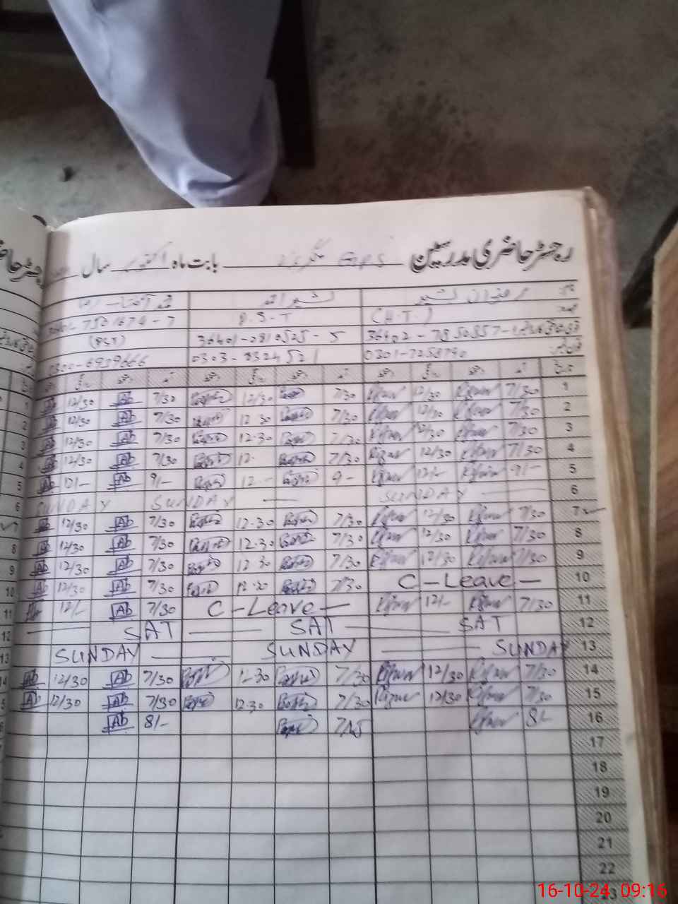 | CNIC | Full Name | Designation | R/C | Absence during last cal. month |