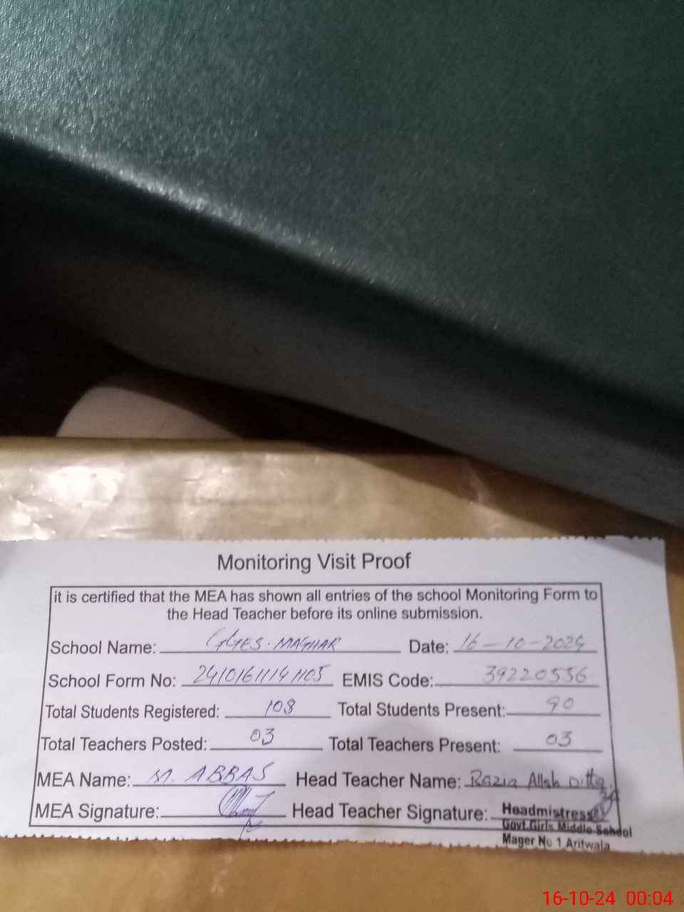 | Attendance Register | Head Teacher | MEA with School | Visit Proof |