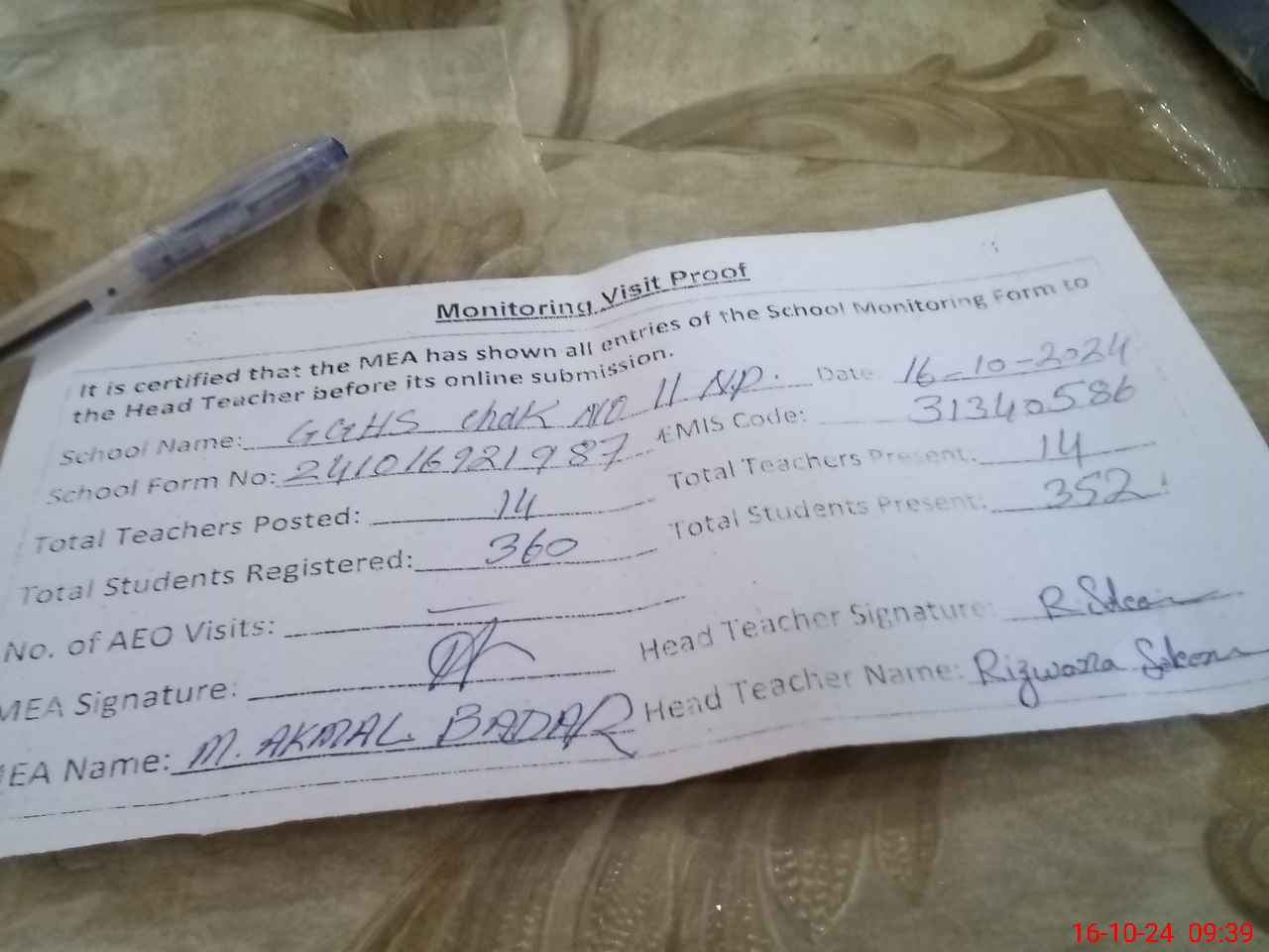 | EMIS Code: 31340586 | Name of School: GGHS CHAK NO. 11/NP | |||