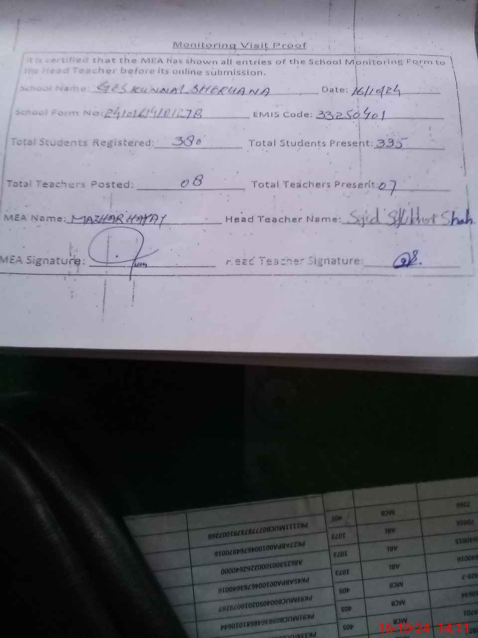| Certified that this School was Inspected by the Undersigned MEA/DMO Today and the Information Stated Above is as Per Record. | |||||