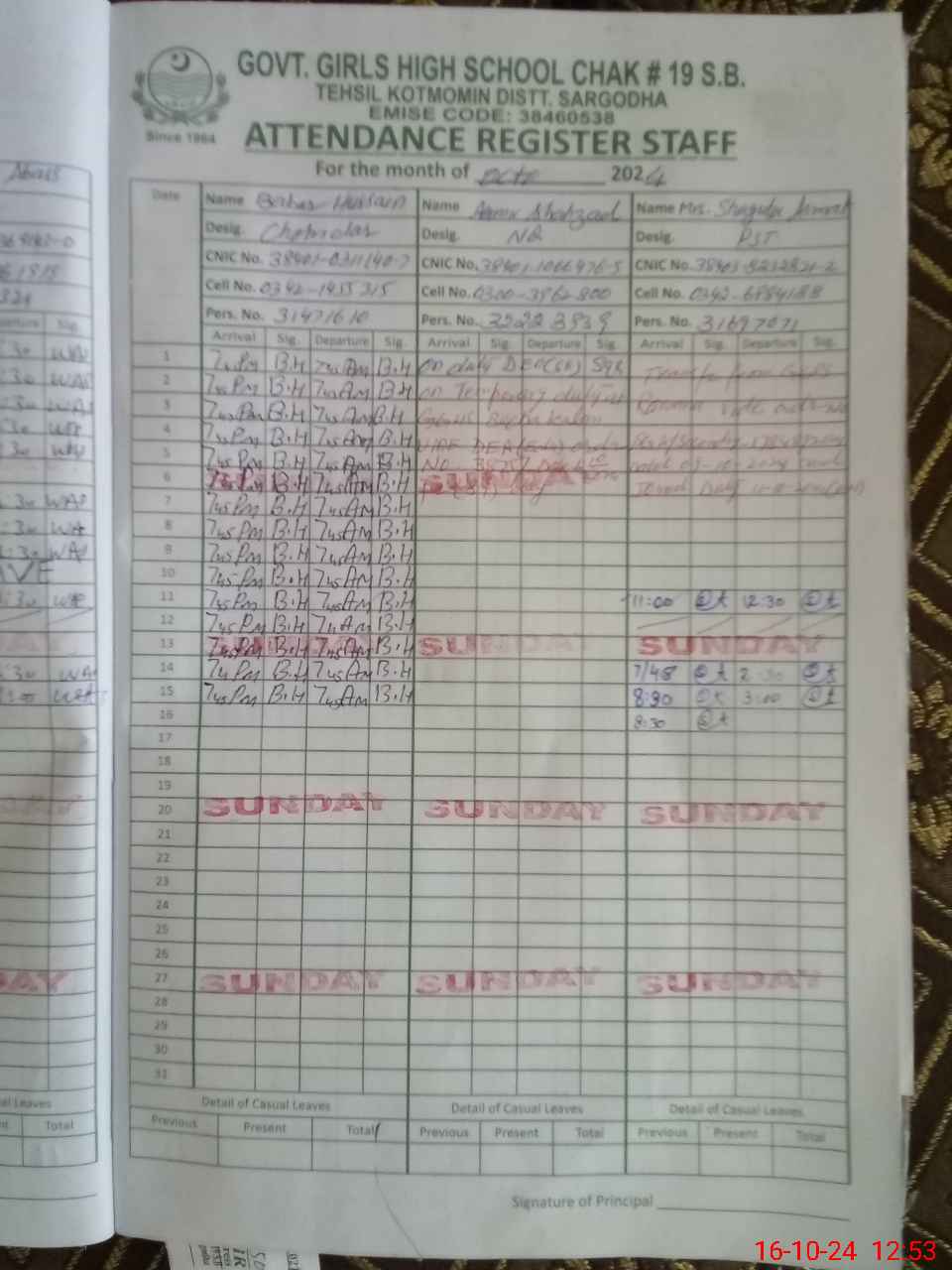 | CNIC | Full Name | Designation | R/C | Absence during last cal. month |