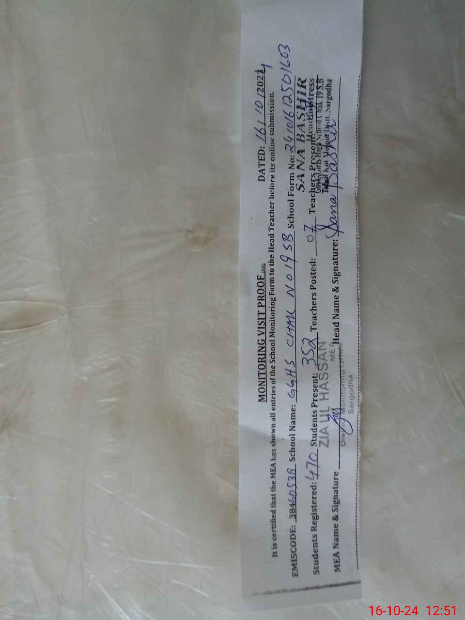 | Certified that this School was Inspected by the Undersigned MEA/DMO Today and the Information Stated Above is as Per Record. | |||||