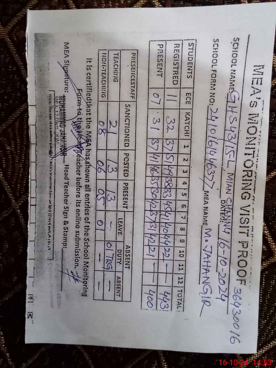 | Certified that this School was Inspected by the Undersigned MEA/DMO Today and the Information Stated Above is as Per Record. | |||||