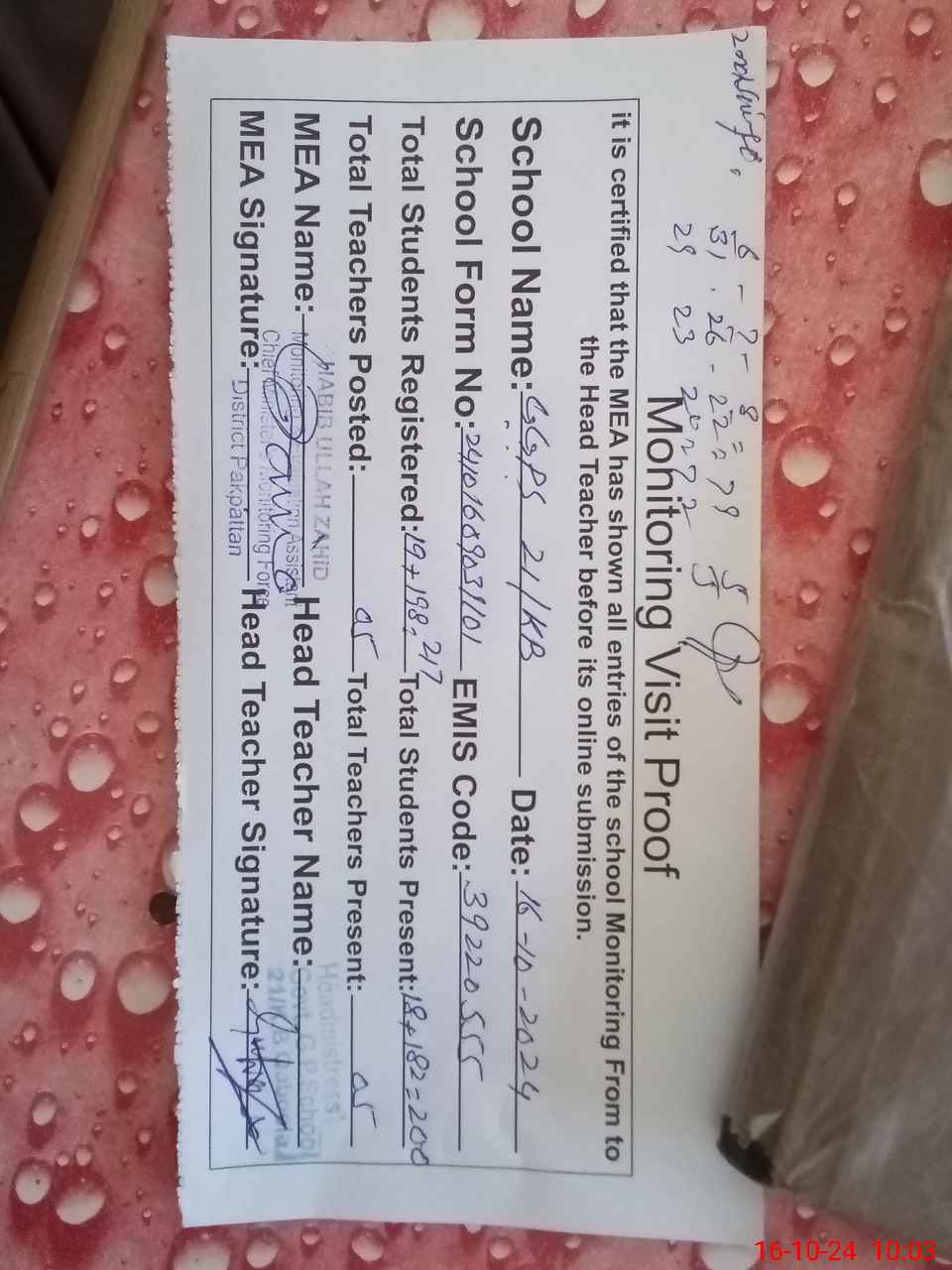 | Attendance Register | Head Teacher | MEA with School | Visit Proof |