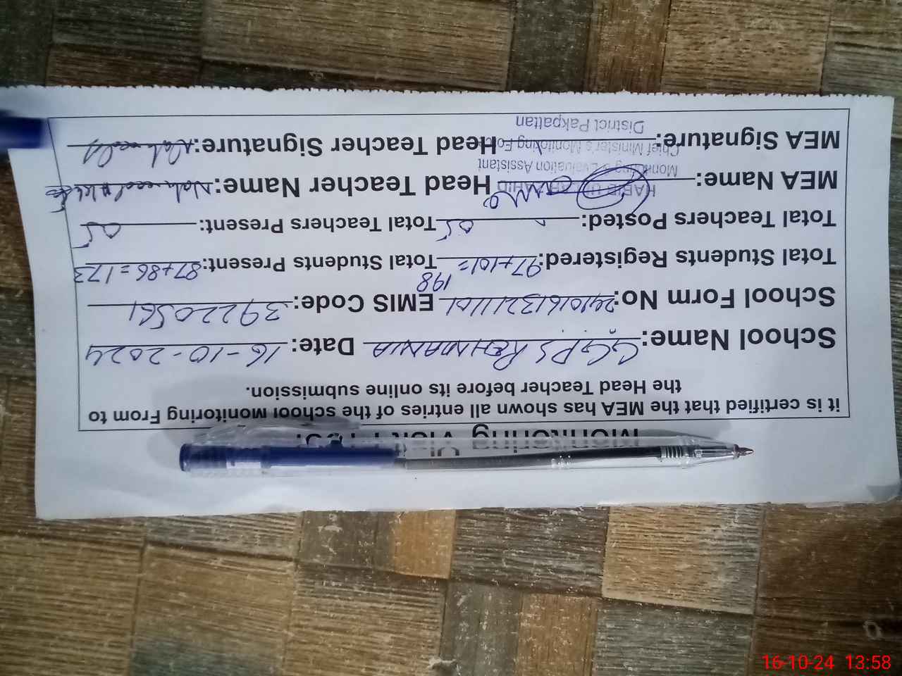 | Certified that this School was Inspected by the Undersigned MEA/DMO Today and the Information Stated Above is as Per Record. | |||||