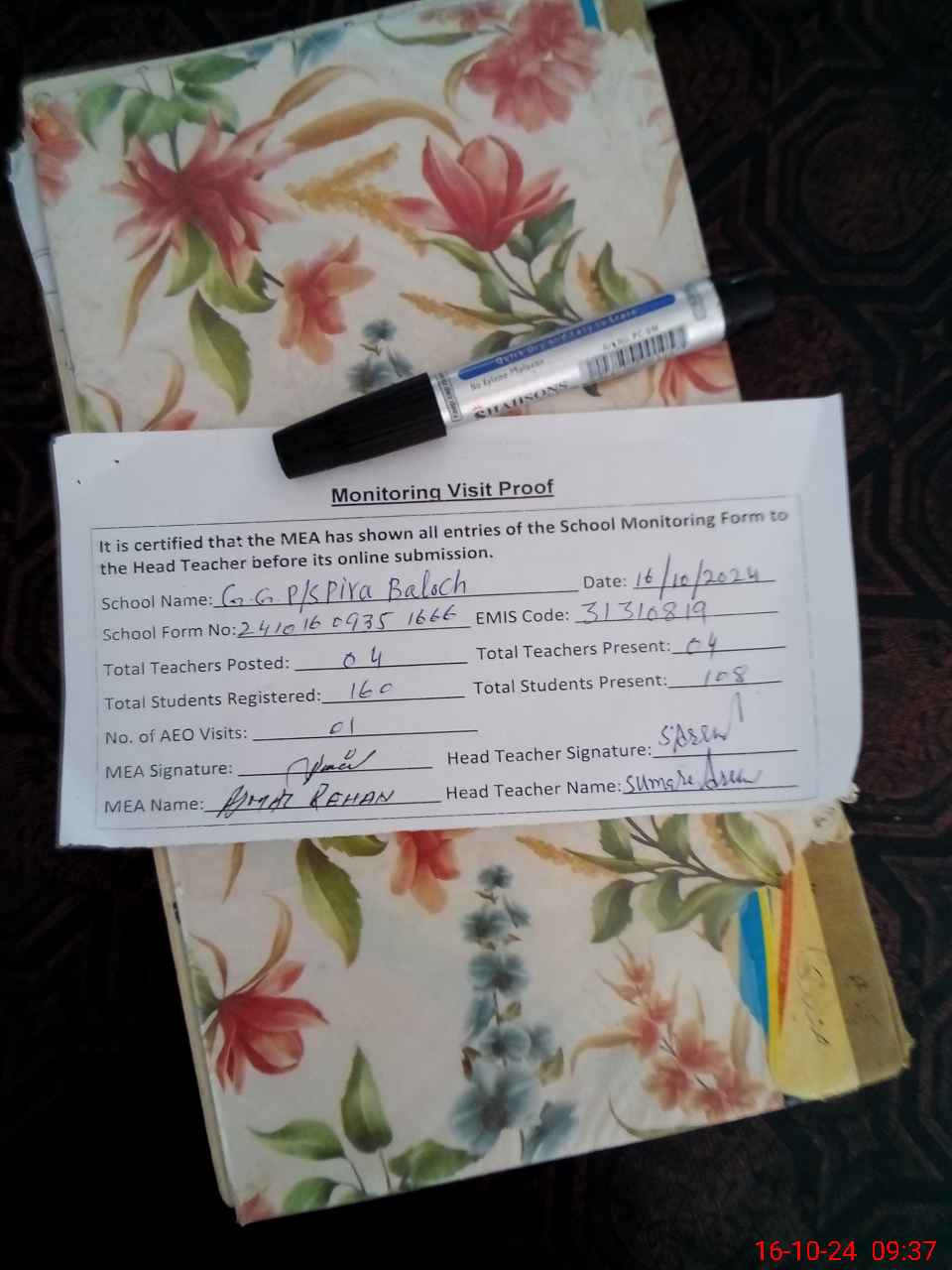 | EMIS Code: 31310819 | Name of School: GGPS PIRA BALOCH (After Noon) | |||