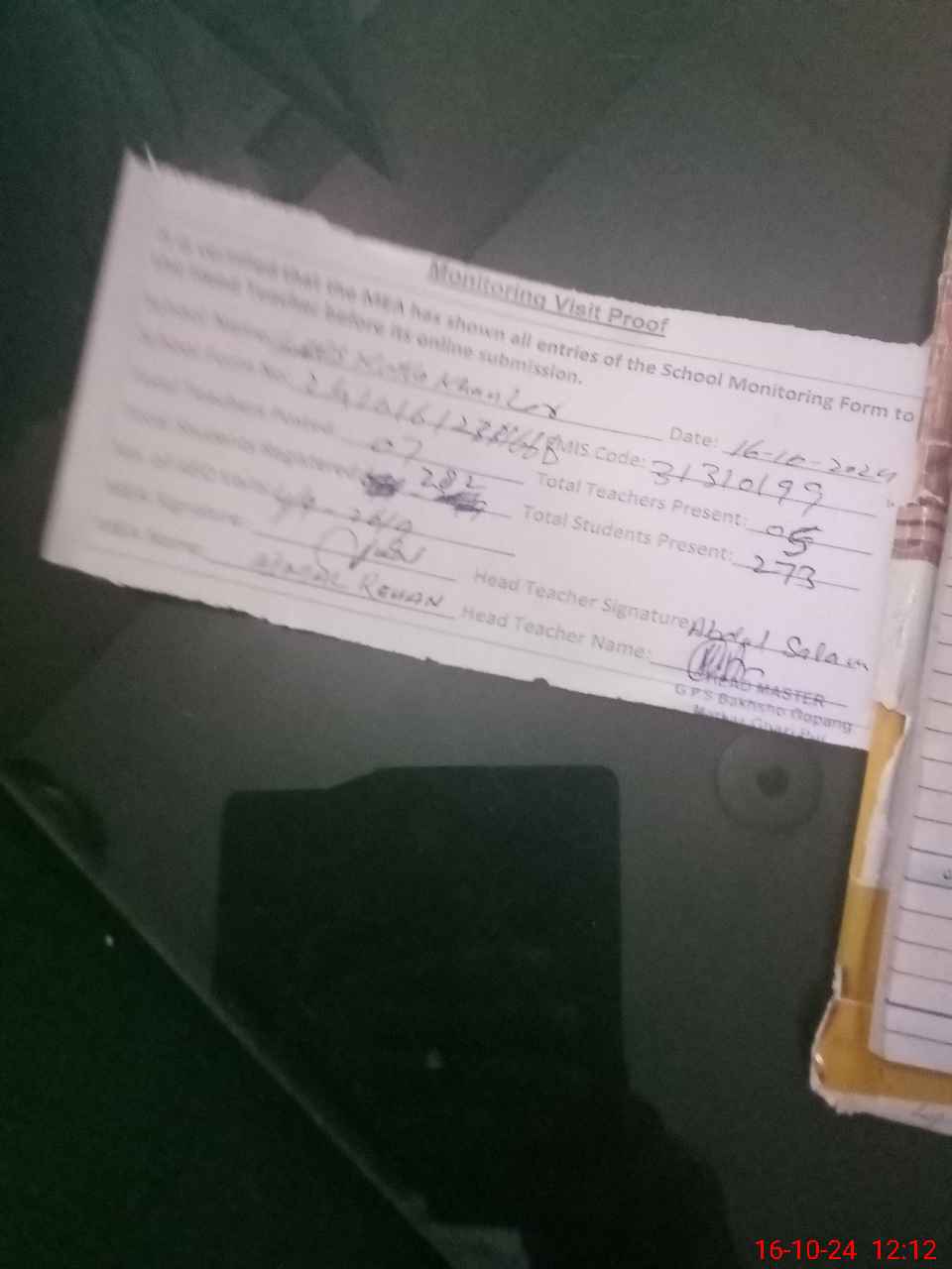 | Attendance Register | Head Teacher | MEA with School | Visit Proof |