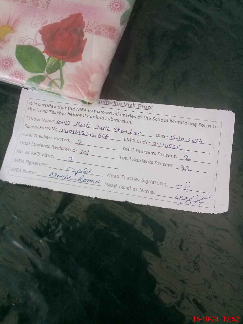 | Certified that this School was Inspected by the Undersigned MEA/DMO Today and the Information Stated Above is as Per Record. | |||||