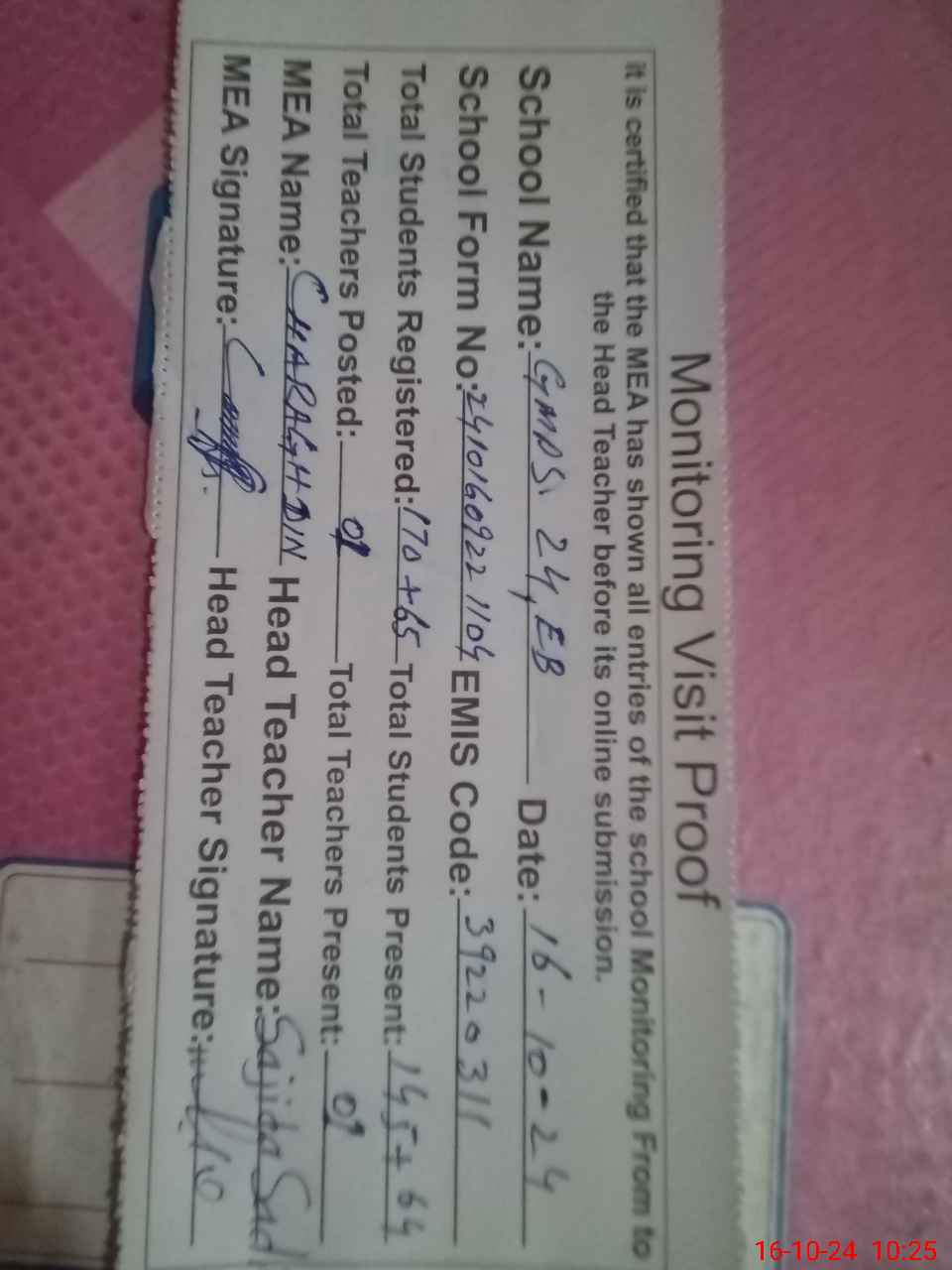 | Certified that this School was Inspected by the Undersigned MEA/DMO Today and the Information Stated Above is as Per Record. | |||||