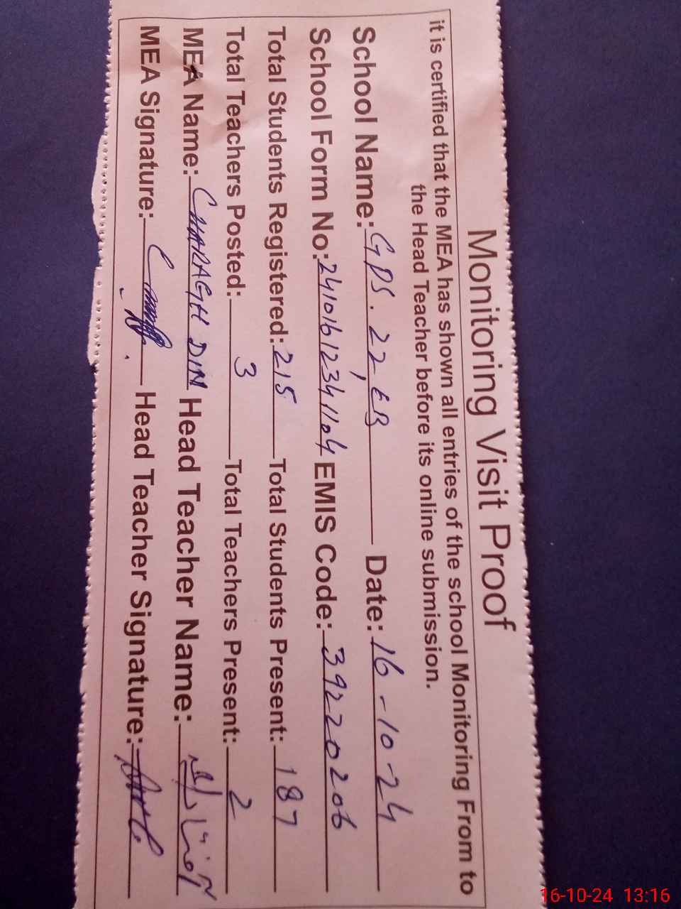| Attendance Register | Head Teacher | MEA with School | Visit Proof |