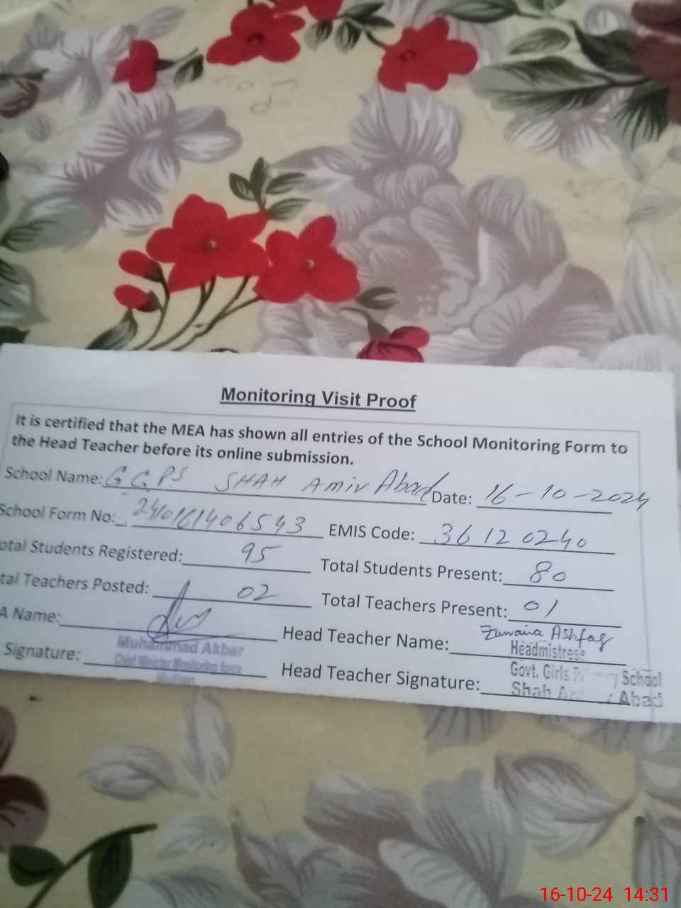 | Attendance Register | Head Teacher | MEA with School | Visit Proof |