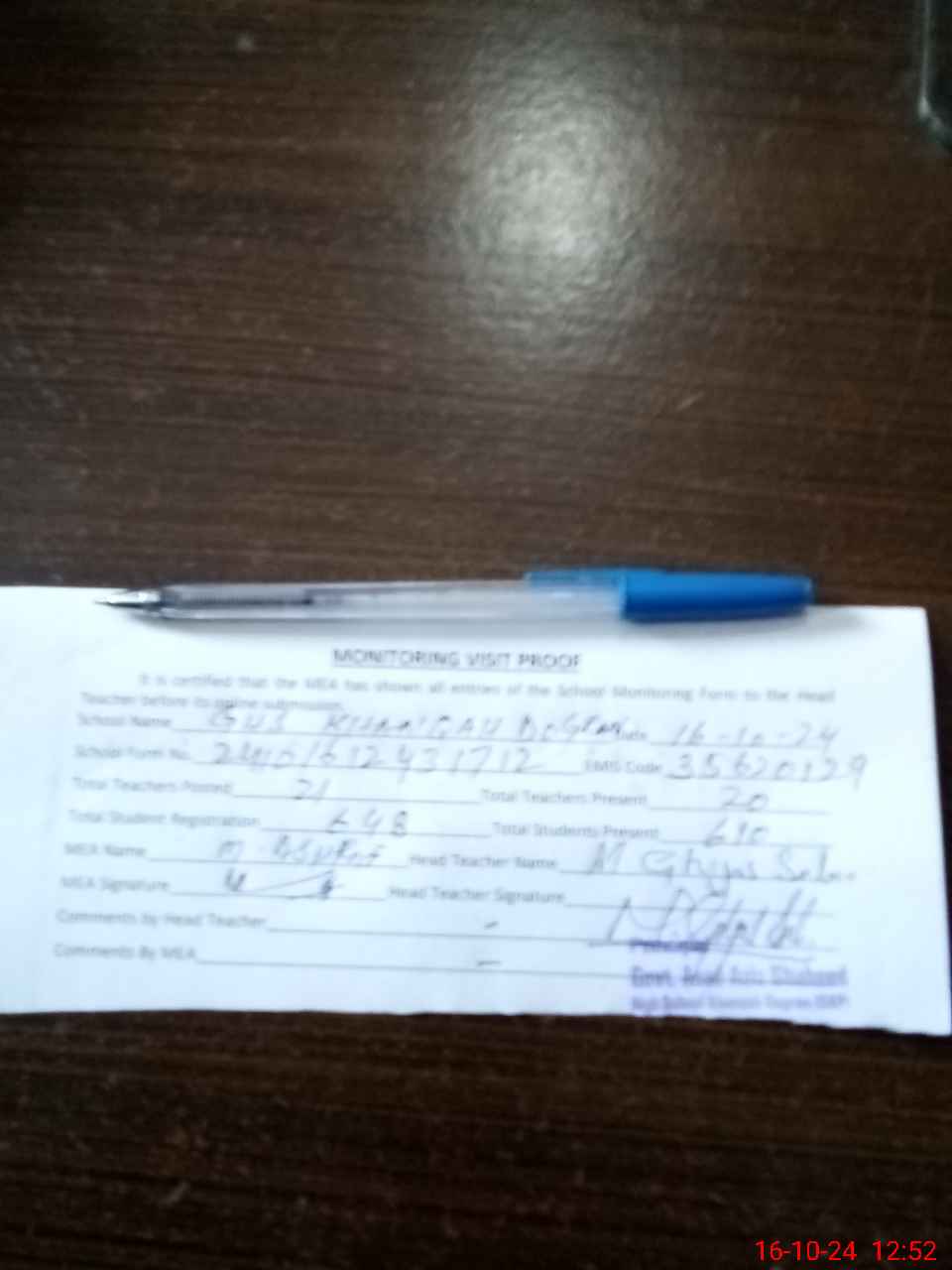 | Certified that this School was Inspected by the Undersigned MEA/DMO Today and the Information Stated Above is as Per Record. | |||||