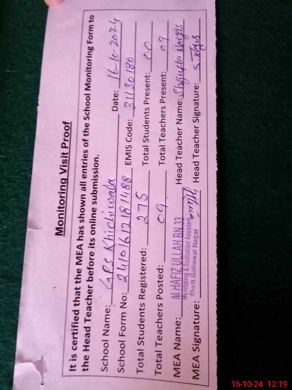 | Certified that this School was Inspected by the Undersigned MEA/DMO Today and the Information Stated Above is as Per Record. | |||||