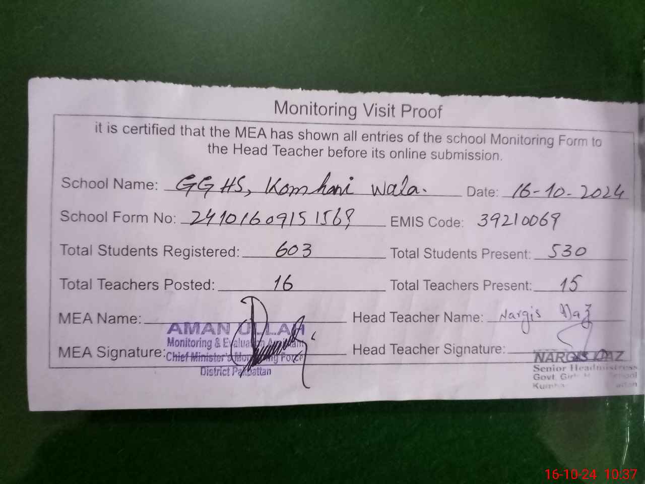 | EMIS Code: 39210069 | Name of School: GGHS KOMHARI WALA | |||