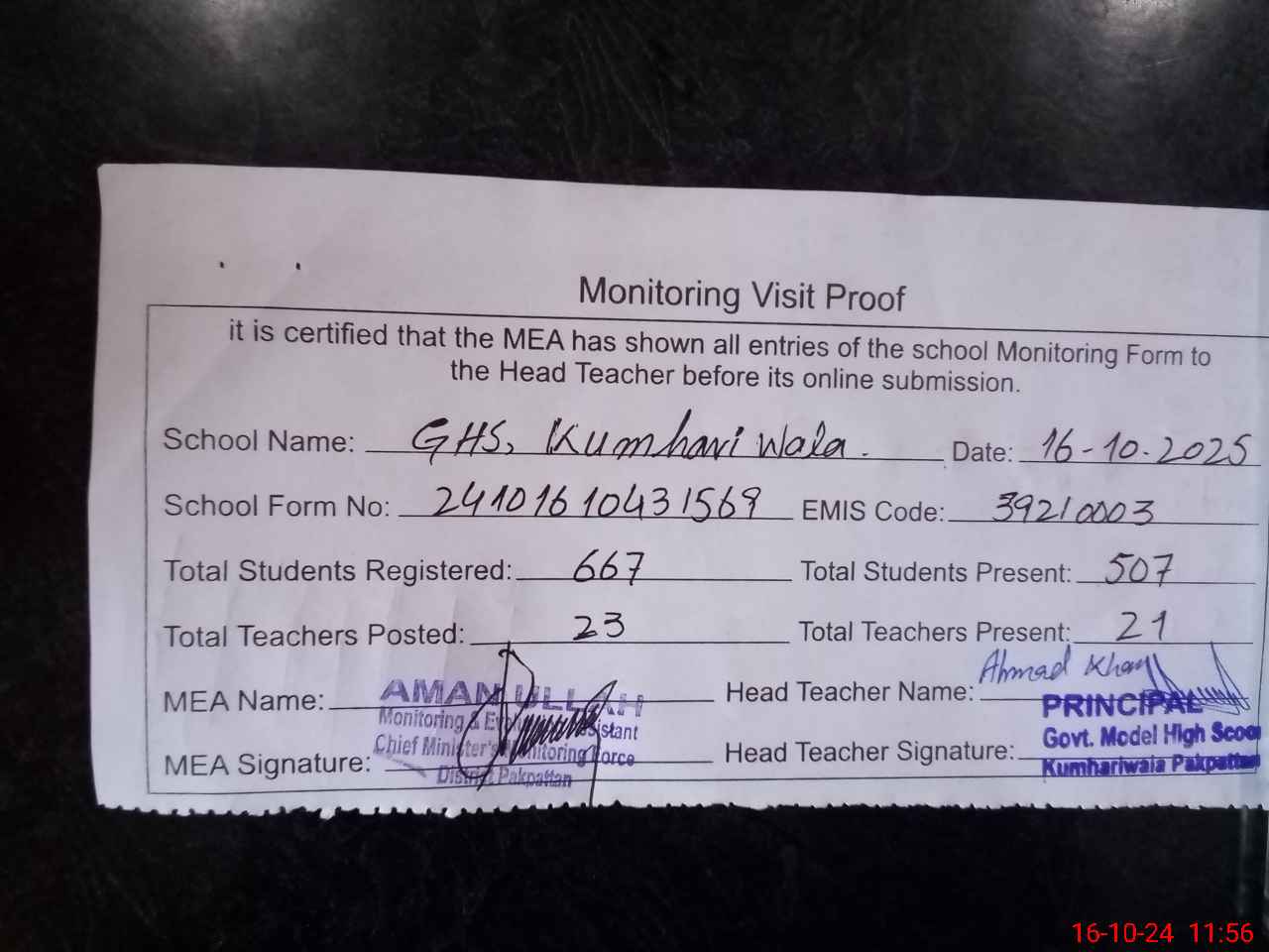 | Attendance Register | Head Teacher | MEA with School | Visit Proof |
