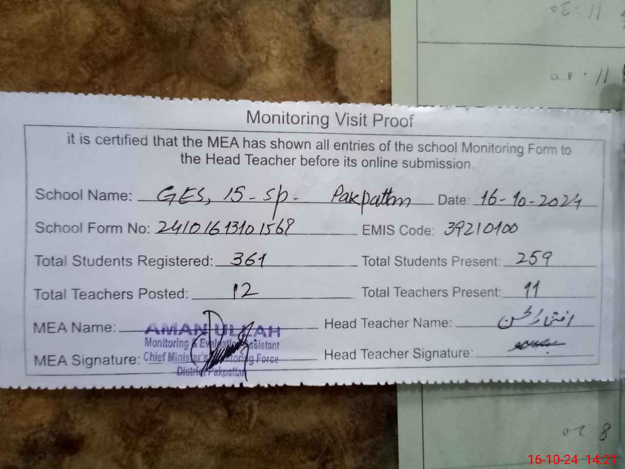 | Attendance Register | Head Teacher | MEA with School | Visit Proof |