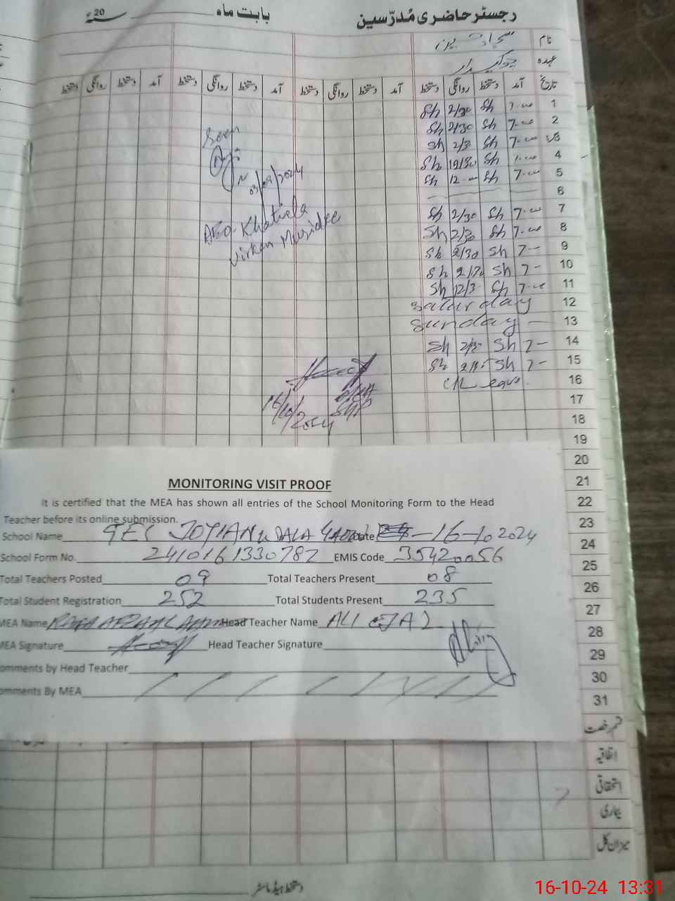 | Attendance Register | Head Teacher | MEA with School | Visit Proof |