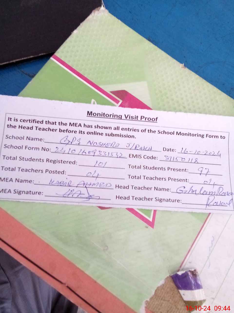 | Attendance Register | Head Teacher | MEA with School | Visit Proof |